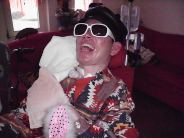 Am Rosenmontag sah es noch so aus, als könne er gar nicht in seinen Rollstuhl umgesetzt werden weil er so schwach und müde war und als Jürgen und ich am Faschingsdienstagmittag zur Einrichtung kamen, damit Martin etwas Ablenkung hat und Unterhaltung wenn die anderen Bewohner feiern, war Betreuerin Karin gerade dabei Martin für die Feier zu richten. Das närrische Motto war in diesem Jahr die 80er Jahre und Martin besitzt rein zufällig ein tolles, buntes Cordhemd aus dieser Zeit. Dieses Hemd hatte er bei einem Flohmarktbesuch vor ein paar Jahren an einem Kleiderständer erspäht und wollte es unbedingt haben. Mit Lederkäppi und Sonnenbrille versehen und glücklich strahlend, ließ Martin sich mit den anderen Bewohnern der Wohngruppe in die Mehrzweckhalle bringen. Anderntags war er völlig erschöpft aber stolz und happy. Gute zwei Stunden hat er es ausgehalten in dem lauten, fröhlichen Trubel der Feier, dann merkten die Betreuer, dass Martins Kraft doch ziemlich nachgelassen hatte und brachten ihn zurück zur Gruppe und in sein Bett. Aber er hat es geschafft, er war mit dabei.