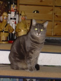 Die beiden Katzenmiezen, die auch hier leben, sind ja ganz hübsch grau getigert, und ich würde ihnen ja gerne mal näher kommen- bloß, wenn sie mir auffordernd zuzwinkern und ich dann auf sie zugehe, fauchen die mich doch tatsächlich an und drehen mir ihren süßen Rücken zu. Na ja, Mädels eben, typisch dafür. Aber die werden schon noch von alleine kommen- weil ich hier nämlich der tollste Kater im Haus bin, jawohl.